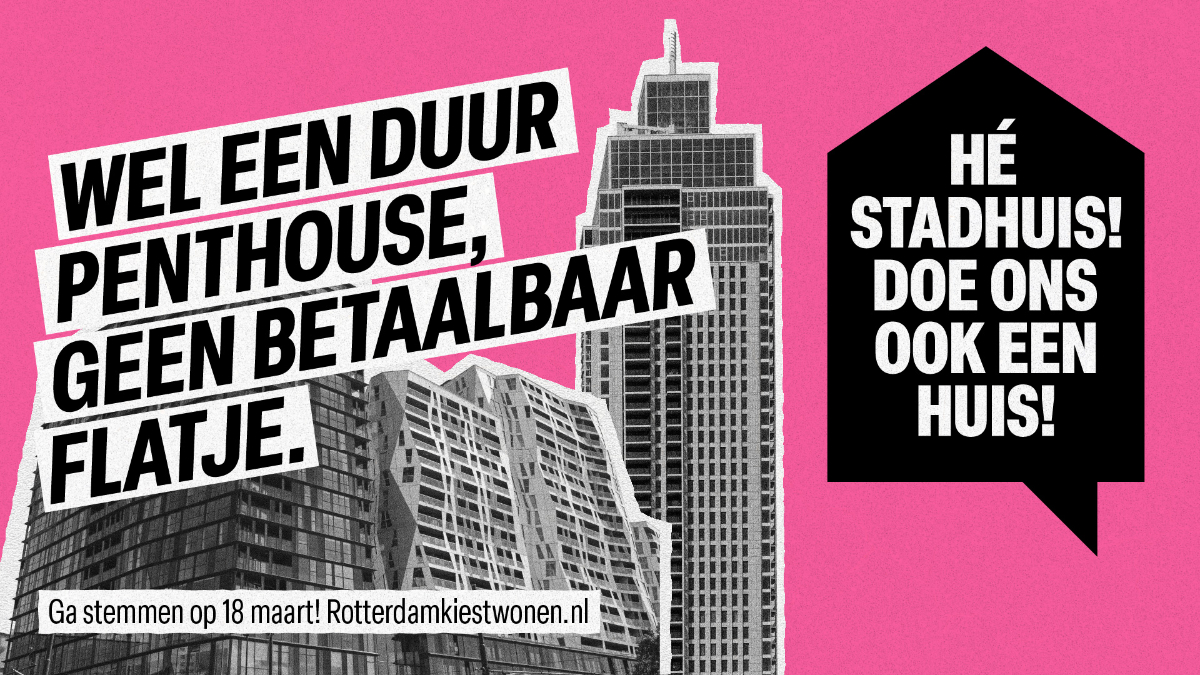 We roepen iedereen op om zich uit te spreken voor een betaalbaar Rotterdam. Dat kan door te gaan stemmen op 18 maart. Want de gemeenteraad bepaalt of en waar er gebouwd mag worden. En zonder de steun van de gemeente kunnen woningcorporaties geen nieuwe woningen bouwen. Terwijl we nu juist meer betaalbare huurwoningen nodig hebben dan ooit.
